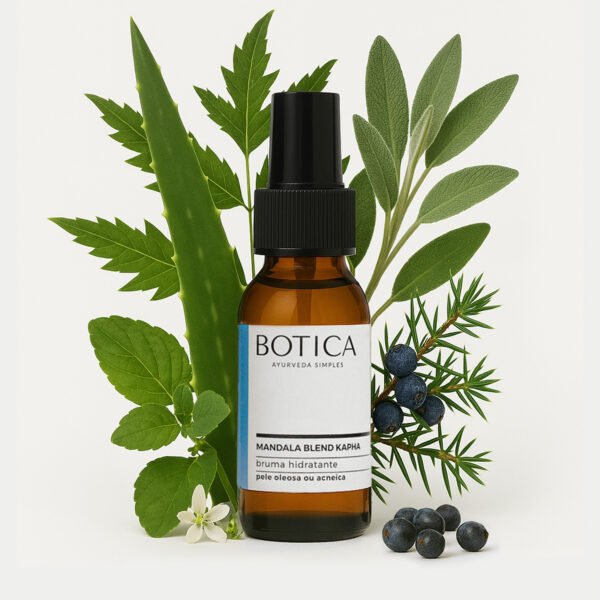 Mandala Blend Kapha é como uma bruma suave, um hidratante facial líquido que tonifica e nutre a pele após a limpeza, composto da mais pura água floral de rosas, enriquecida com aloe vera e medicada com extratos orgânicos de neem, sálvia e tulsi e perfumada com óleo essencial indiano de zimbro, para proporcionar drenagem e desintoxicação à pele do tipo Kapha que tende a reter líquidos e toxinas.