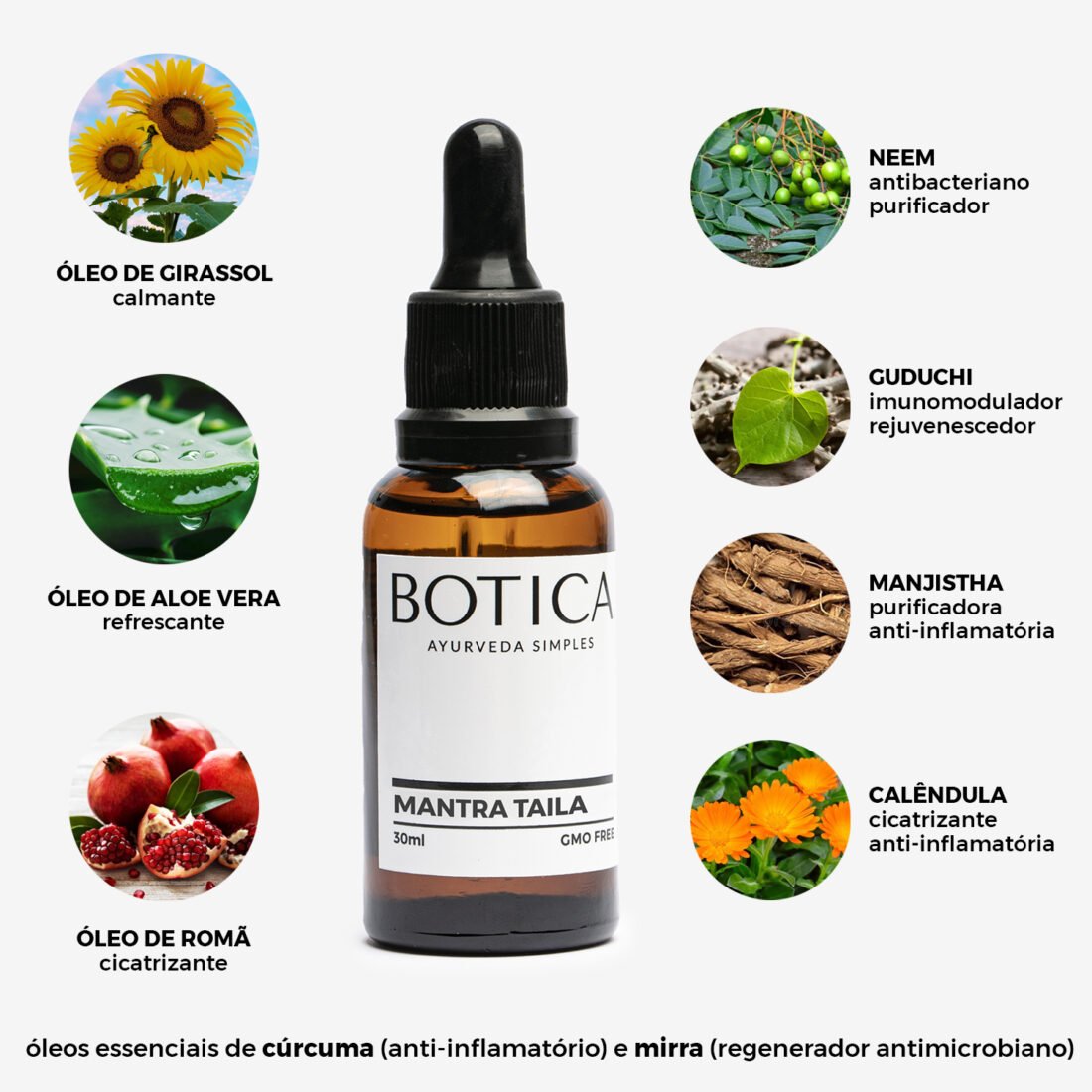 | COMPOSIÇÃO | óleo vegetal de girassol, óleo vegetal de aloe vera, óleo vegetal de romã, aloe vera, neem, guduchi, calêndula, manjistha, hibisco, óleo essencia de cúrcuma, óleo essencial de mirra. |