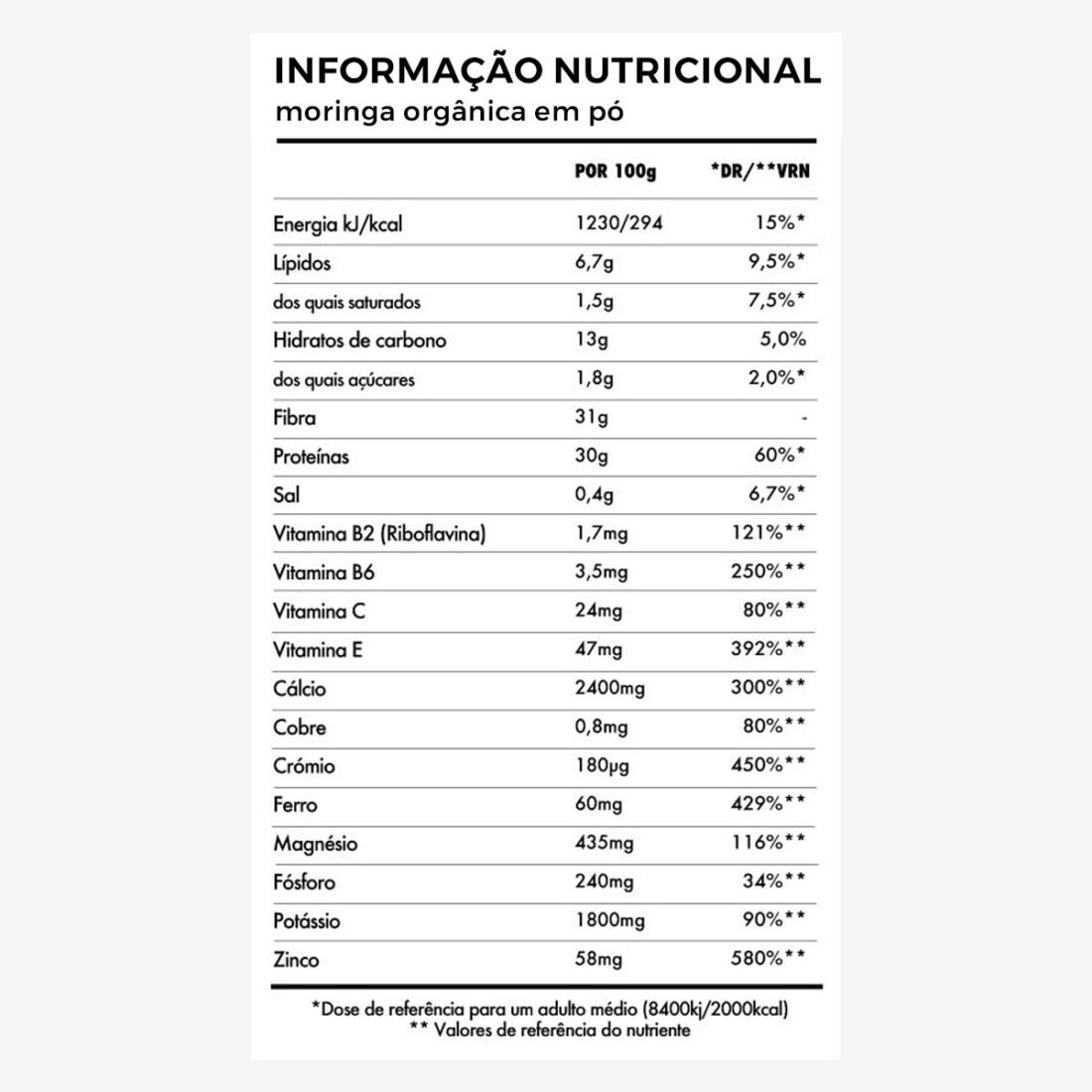 A Moringa é rica em nutrientes e aminoácidos, rica em vitaminas A e E e antioxidantes, fortalece o sistema imunológico, diurética, rica em ferro, cálcio e potássio, auxilia na saúde cardiovascular, rica em nutrientes e anti-inflamatórios, previna e ajuda a controlar diabetes. Ótima fonte de ferro, cálcio e fibra, a moringa é uma das plantas mais nutritivas do planeta. Conhecida como a “árvore da vida”, muitos a consideram benéfica para desintoxicação e controle da inflamação pós-exercício. Nosso extrato em pó é produzido artesanalmente, com folhas lavadas e separadas em um minucioso controle de qualidade.
