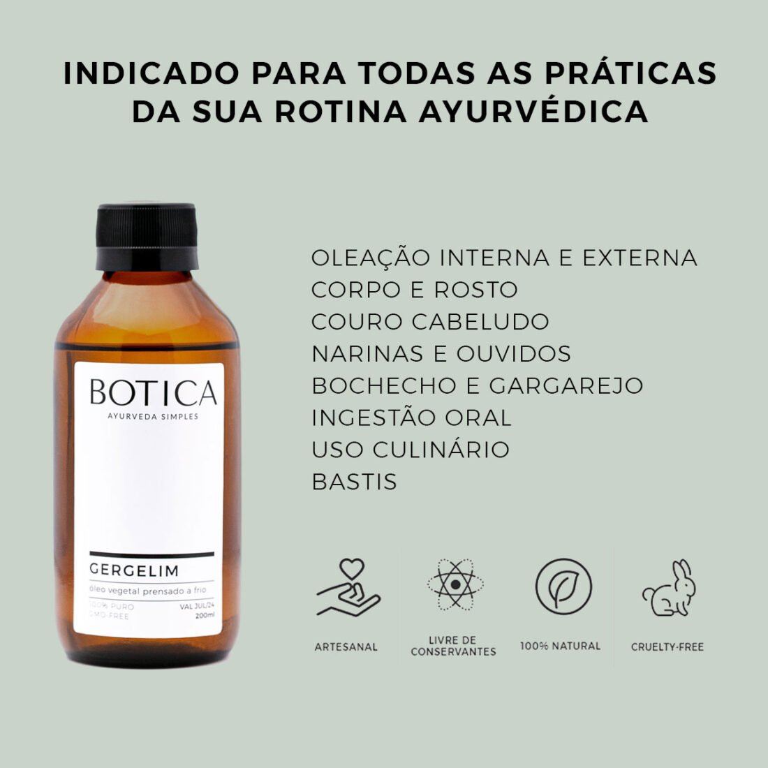 O óleo de gergelim, é conhecido desde os tempos védicos e conhecido como o melhor de todos os óleos. Sob a perspectiva ayurvédica, o óleo de gergelim tem uma qualidade doce, picante, adstringente e amarga, com efeito de aquecimento. É rico em ácido linoleico e possui propriedades antibacterianas, anti-inflamatórias e antioxidantes. Também é o óleo tradicional preferido da Abhyanga, a prática de oleação do corpo.