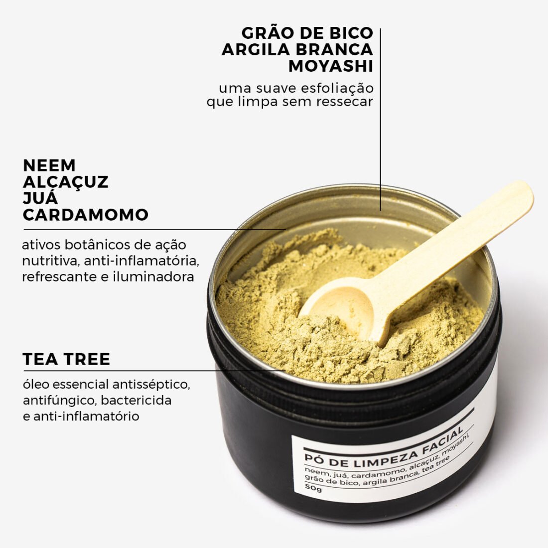 | COMPOSIÇÃO | Cicer Arietinum Seed Powder (grão de bico), Vigna Mungo (moyashi), Glycyrrhiza glabra (alcaçuz), Melia Azadirachta Leaf (neem), Kaolin (argila branca), Elettaria cardamomum seed (cardamomo), Ziziphus joazeiro Mart (juá), Melaleuca Alternifolia Leaf Oil (óleo essencial de tea tree). |