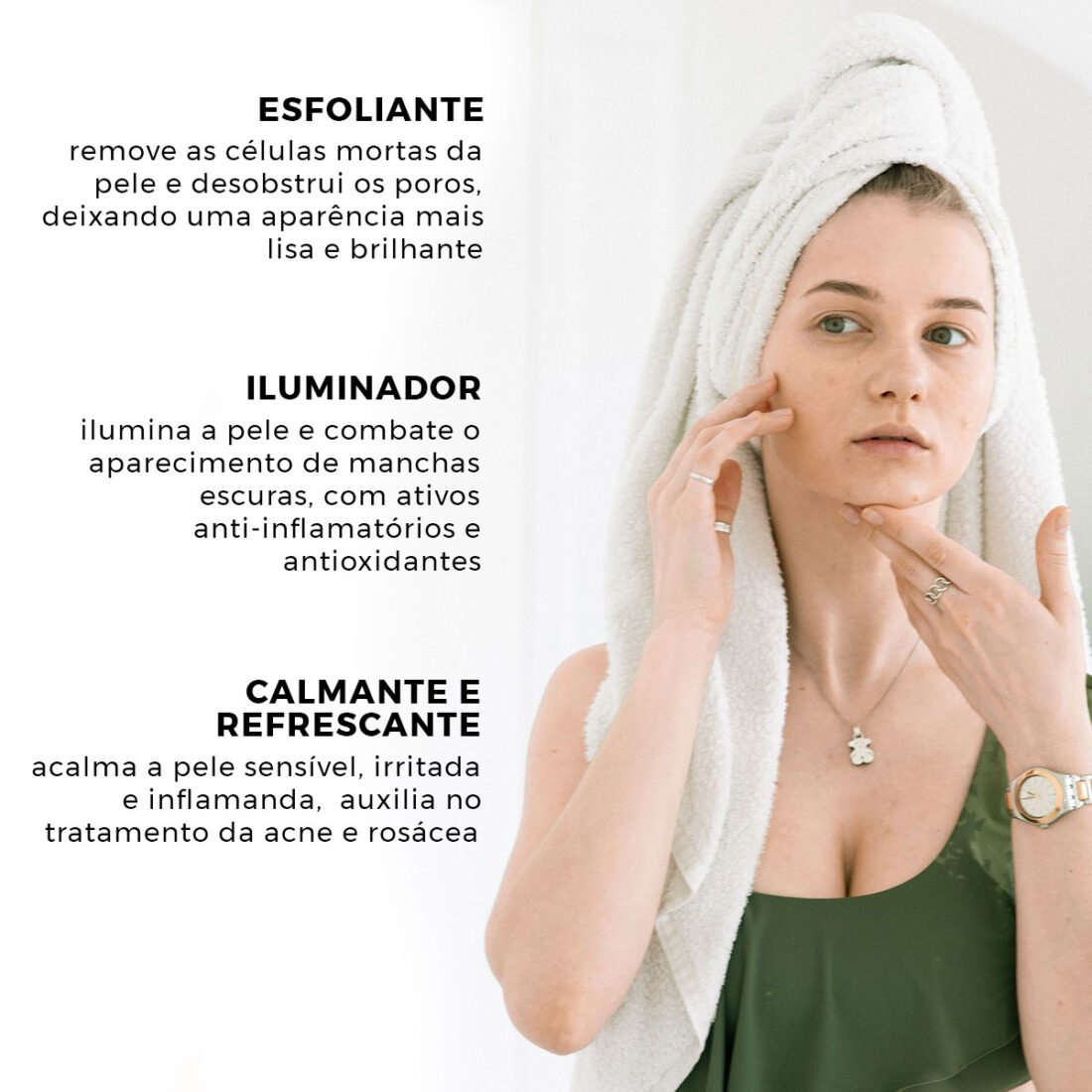 - Antienvelhecimento: Reduzi o aparecimento de linhas finas e rugas. Contém ativos com propriedades adstringentes que ajudam a firmar a pele.