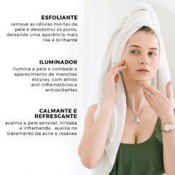 O uso diário promove uma uniformização gradual da textura e tom da pele, um equilíbrio perfeito que controla a oleosidade e promove a renovação celular combatendo a sensibilidade.