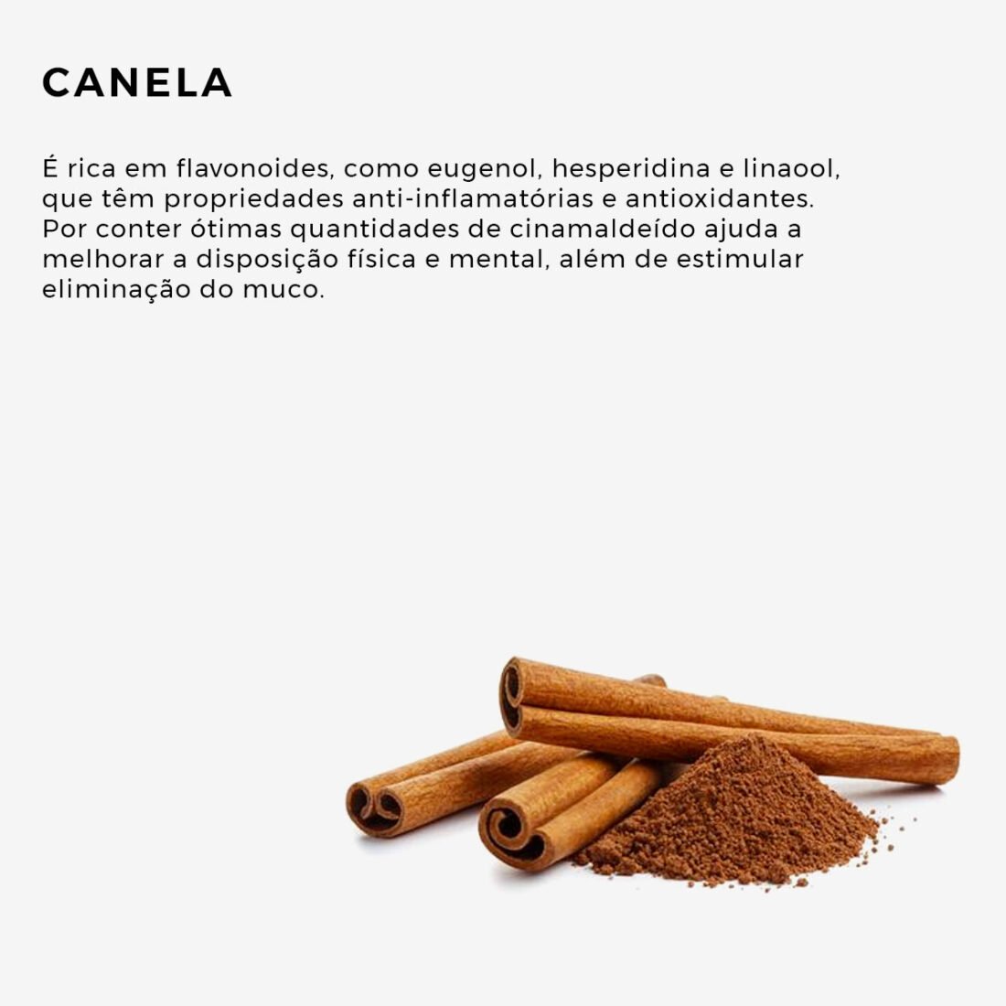 Canela: É rica em flavonoides, como eugenol, hesperidina e linaool, que têm propriedades anti-inflamatórias e antioxidantes. Por conter ótimas quantidades de cinamaldeído ajuda a melhorar a disposição física e mental, além de estimular eliminação do muco.