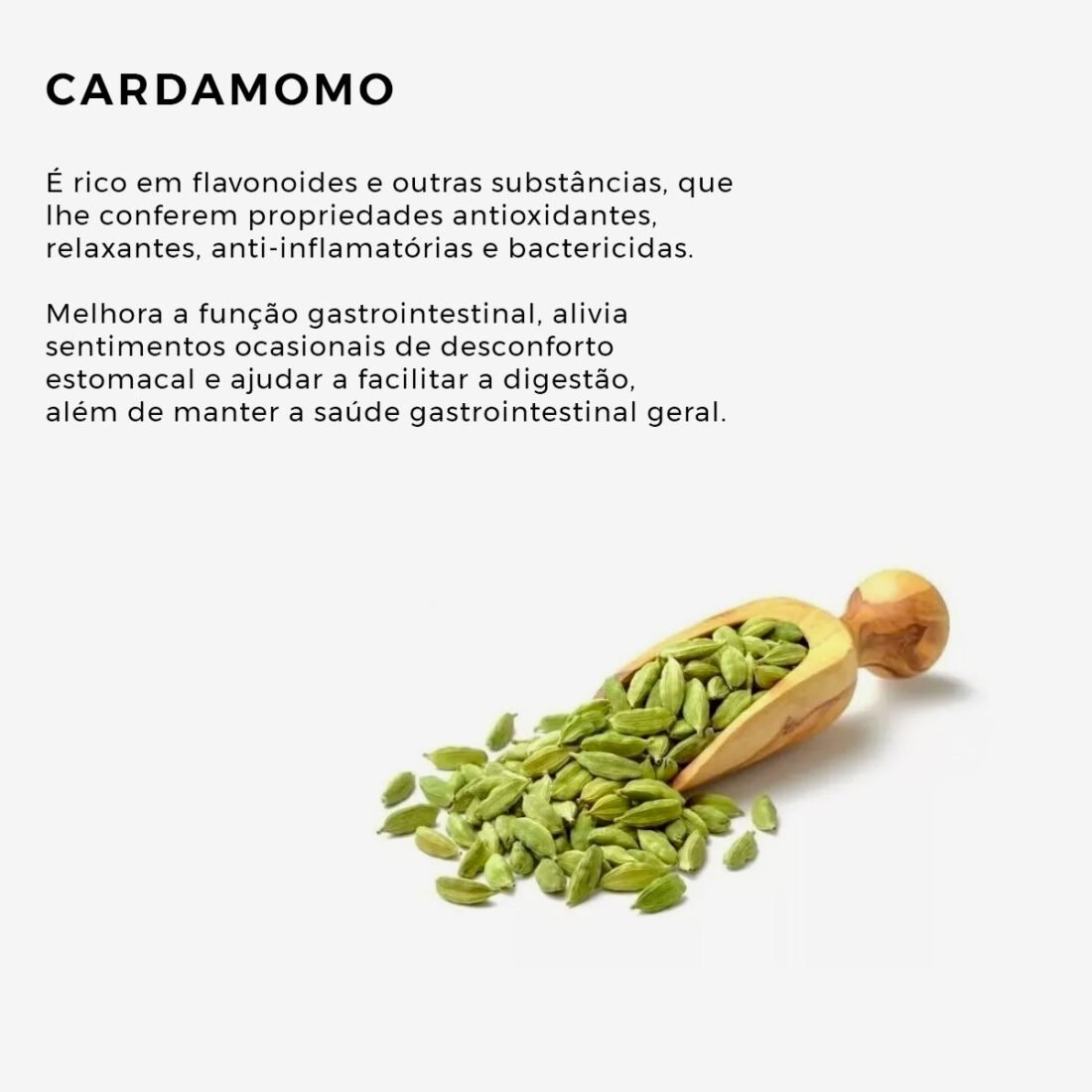 Cardamomo: É rico em flavonoides e outras substâncias, que lhe conferem propriedades antioxidantes, relaxantes, anti-inflamatórias e bactericidas. Melhora a função gastrointestinal, alivia sentimentos ocasionais de desconforto estomacal e ajudar a facilitar a digestão, além de manter a saúde gastrointestinal geral.