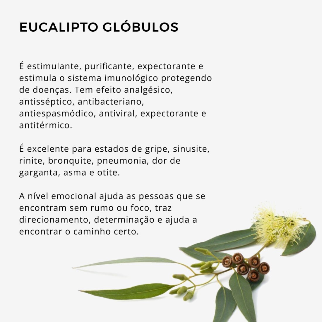 Eucalipto-Glóbulos: É estimulante, purificante, expectorante e estimula o sistema imunológico protegendo de doenças. Auxilia no tratamento de doenças respiratórias e infecciosas em geral, em casos de gripe, resfriado, rinite, sinusite, bronquite e muco. Tem efeito analgésico, antisséptico, antibacteriano, antiespasmódico, antiviral, expectorante e antitérmico. É excelente para estados de gripe, sinusite, rinite, bronquite, pneumonia, dor de garganta, asma e otite. A nível emocional ajuda as pessoas que se encontram sem rumo ou foco, traz direcionamento, determinação e ajuda a encontrar o caminho certo.