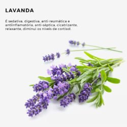 Lavanda: É sedativa, digestiva, anti-reumática e antiinflamatória, anti-séptica, cicatrizante, relaxante, diminui os níveis de cortisol.