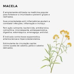 Macela: Fortalece a imunidade e prevene gripes e resfriados. Suas propriedades anti-inflamatórias ajudam a combater infecções, inflamação e inchaço. Tem ação calmante, bactericida, antidiarreica, colinolítica, miorrelaxante, antiespasmódica, digestiva, estomáquica, emenagoga, antiviral. É indicada contra tosse espasmódica, arteriosclerose e hipercolesterolemia. Estimulante da circulação capilar, contra queda de cabelos, peles e cabelos delicados.
