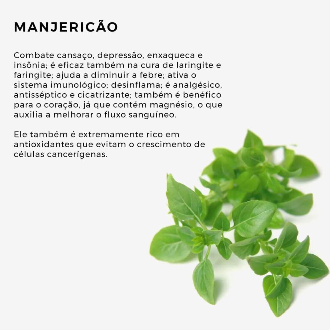 Manjericão: Combate cansaço, depressão, enxaqueca e insônia; é eficaz também na cura de laringite e faringite; ajuda a diminuir a febre; ativa o sistema imunológico; desinflama; é analgésico, antisséptico e cicatrizante; também é benéfico para o coração, já que contém magnésio, o que auxilia a melhorar o fluxo sanguíneo. Ele também é extremamente rico em antioxidantes que evitam o crescimento de células cancerígenas.
