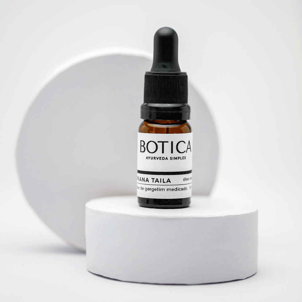 Óleo de gergelim medicado com manjericão, eucalipto, lavanda, macela, cardamomo, gengibre e canela, para uso nasal.
