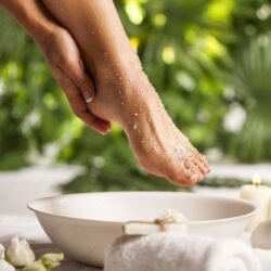 O sal de Epsom é um composto mineral puro (sulfato de magnésio) em forma de cristal que esfolia suavemente a pele e suaviza manchas ásperas.