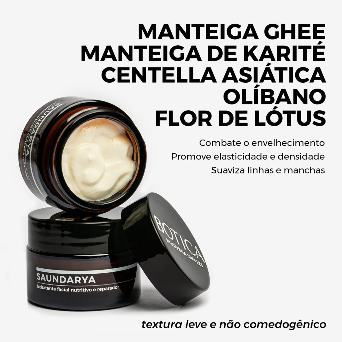 Saundarya é um luxuoso creme facial à base de shata dhauta ghrita (manteiga ghee emulsionada) e karité medicado com extratos botânicos de olíbano e centella asiática com óleo essencial de lótus azul, uma formulação nutritiva e antioxidante, livre de aditivos sintéticos e parabenos, que combate o ressecamento e promove o rejuvenescimento da pele. Restaura a barreira cutânea, previne linhas, descamação e sensibilidade.