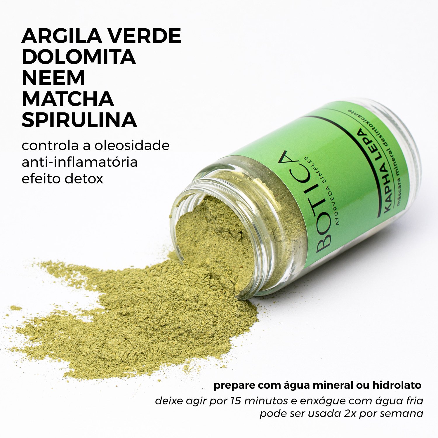 Kapha Lepa combina os benefícios da argila verde e da dolomita com os efeitos desintoxicantes e adstringentes do neem e o poder antioxidante e anti-inflamatório do matchá e da spirulina, proporcionando desintoxicação e drenagem para a pele do tipo Kapha ou que sofre com oleosidade, retenção de líquidos e poros dilatados.